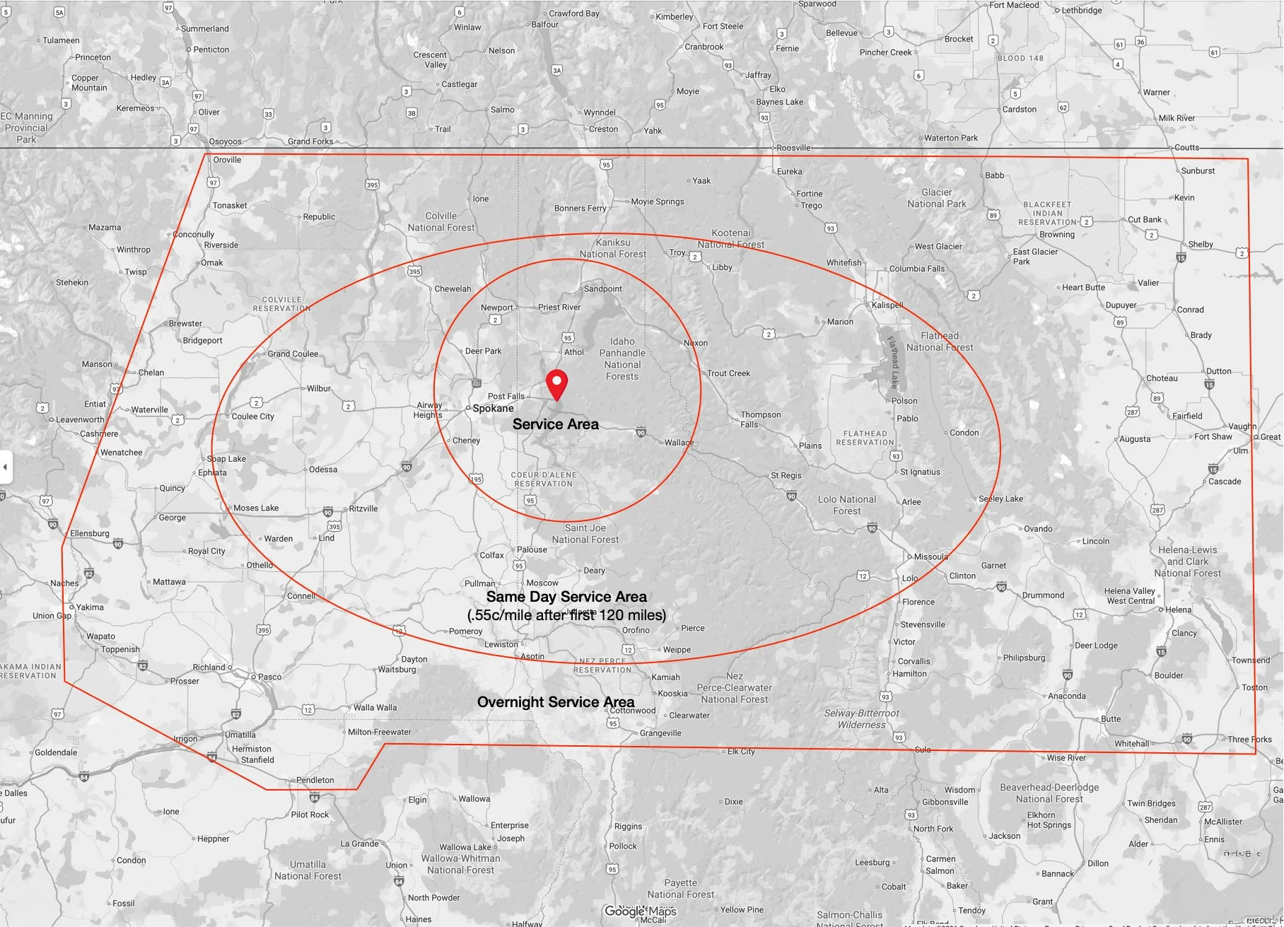 We get around. There is no travel charge for any location in our Immediate Service Area within 60 miles of Coeur D’Alene, but travel frequently across the Inland Pacific Northwest: